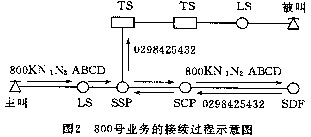 --用戶在撥打800號業(yè)務用戶號碼時,首先由網(wǎng)絡點上的普通電話交換機接收,并把800KN1N2ABCD號碼經(jīng)話路傳送給業(yè)務交換點SSP,再由SSP將此號碼經(jīng)No.7信令鏈路送到業(yè)務控制點SCP,SCP通過在業(yè)務數(shù)據(jù)庫SDP中查尋譯碼表將此號碼翻譯成普通的電話號碼回送SSP,最后由SSP負責完成電路的連接,該過程如圖2所示。