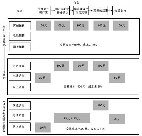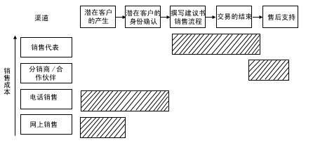 渠道整合強(qiáng)調(diào)在一個(gè)銷售過程中分工的不同給企業(yè)帶來更多的利潤,將銷售過程的任務(wù)一一分配給不同成本的渠道來完成。銷售過程的中間環(huán)節(jié)——面對面的銷售和交易的達(dá)成,通常需要由成本較高的區(qū)域銷售代表和分銷伙伴來完成,客戶的產(chǎn)生及身份的確認(rèn)和售后服務(wù)環(huán)節(jié)通常由低成本渠道完成,F(xiàn)在,我們對照圖4來比較一下: