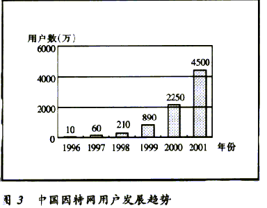 據(jù)CNNIC統(tǒng)計(jì)的數(shù)據(jù)表明,到2000年12月31日止,中國的因特網(wǎng)用戶達(dá)到2250萬戶,上網(wǎng)計(jì)算機(jī)892萬臺(tái),預(yù)計(jì)2001年中國將有超過4500萬的網(wǎng)民。中國域名總數(shù)為12.2萬個(gè),WWW站點(diǎn)數(shù)26.54萬個(gè)。中國因特網(wǎng)的發(fā)展速度驚人,與國際因特網(wǎng)的發(fā)展速度相當(dāng)。中國因特網(wǎng)用戶發(fā)展趨勢見圖3。