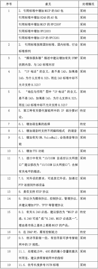 附表:8月1日~2日,網絡與交換標準研究組對于“基于軟交換的媒體服務器的技術要求”的征求意見選登。