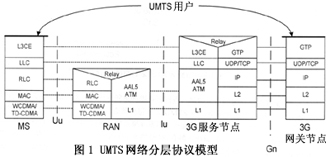 對圖1的簡要描述如下:移動用戶(MS)到RAN左側(cè)部分是無線接入網(wǎng)絡(luò)的無線用戶接口(Uu),實現(xiàn)了用戶業(yè)務(wù)通過空中無線鏈路接入3G網(wǎng)絡(luò)的功能,主要包含物理層(采用WCDMA和TD-CDMA技術(shù))、媒體接入層(MAC)、無線鏈路層(RLC);在RAN內(nèi)部通過協(xié)議中繼(Relay)實現(xiàn)無線鏈路和有線鏈路的對接;在RAN和3G服務(wù)節(jié)點(diǎn)之間的接口(Iu)是以ATM技術(shù)為支撐的有線接入段協(xié)議,為支持Internet業(yè)務(wù),采用AAL5適配層協(xié)議,物理層(L1)無明確限定具體傳輸方式;在此之上,透過RAN、MS和3G服務(wù)節(jié)點(diǎn)之間存在兩個高層連接,即邏輯聯(lián)絡(luò)層(LLC)和更為復(fù)雜的第三層實體(L3CE),L3CE是一些以Client/Server方式構(gòu)件的軟件實體,實現(xiàn)諸如無線資源管理、呼叫控制、移動管理等網(wǎng)絡(luò)級功能;在3G服務(wù)節(jié)點(diǎn)內(nèi)部,為實現(xiàn)到Internet網(wǎng)絡(luò)的接入,再作一次協(xié)議中繼,這里,第三層實體的信息映射到通用分組無線服務(wù)的隧道協(xié)議GTP(GPRS Tunneling Protocol);3G服務(wù)訪問點(diǎn)到3G網(wǎng)關(guān)之間的Gn接口存在清晰的、以TCP/IP協(xié)議為主體的五層對應(yīng)關(guān)系;構(gòu)建在最上層的是移動用戶到3G網(wǎng)關(guān)的UMTS用戶進(jìn)程,它通過3G網(wǎng)關(guān)進(jìn)入Internet骨干網(wǎng),最終實現(xiàn)用戶對Internet的訪問。