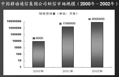 “從2001年的189億條增長(zhǎng)到2002年的超過(guò)900億條,我國(guó)短信業(yè)務(wù)的增長(zhǎng)率是移動(dòng)用戶數(shù)增長(zhǎng)率的3.4倍! 計(jì)世資訊分析師許牧說(shuō)。