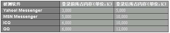 在使用Windows平臺下的PC也只有內(nèi)存還稍顯珍貴,所以就這四款軟件所占用的內(nèi)存進(jìn)行了對比。結(jié)果如下:Yahoo! Messenger所占的內(nèi)存,無論在登錄前后都是最小的;第二名,MSN Messenger在功能龐大的情況下,能做得如此精巧實(shí)屬難得;第三名,ICQ從2000版開始對內(nèi)存的占用始終比較穩(wěn)定,只是在出了中文界面后稍高一些;第四名,QQ啟動出現(xiàn)登錄界面時還沒顯出味口有多大,不想登錄后隨著系統(tǒng)信息和Flash廣告等傳到客戶端占用內(nèi)存的峰值竟然能達(dá)到15,000K,相信內(nèi)存小一些的機(jī)器在QQ登錄后就要多等一會兒了。