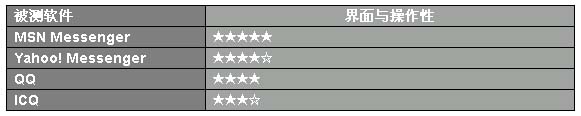 對于IM類軟件來說,網(wǎng)友希望其界面在精美的同時越簡單越直接越好。在這一點(diǎn)上,MSN Messenger最為突出,界面精致,操作極易上手,在本次評測中獲得一致認(rèn)可,位列第一;Yahoo! Messenger操作上也比較直觀,只是“做工”顯得有些粗糙;被測的QQ2003剛剛在界面上做了重大的改變,只是稍顯零亂,對MSN的部分借鑒比較成功,對于一個新用戶來說最基本的功能的使用還算方便;ICQ功能的確強(qiáng)大,界面有些老舊,(ICQ Lite可以改變這一切,但是ICQ Lite僅僅是ICQ的一個插件版本,本次評測沒有考慮),ICQ操作對中文用戶來說也過于繁復(fù)。