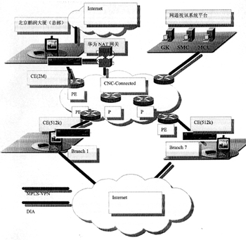 鑒于客戶是通信公司,有較強的系統(tǒng)管理能力,而且要求視訊和數(shù)據(jù)出口分開,視訊出口在北京,可以和VPN線路走相同的物理鏈路,不會造成路由設(shè)計上的問題,故將NAT放在客戶公司總部,由用戶自己管理,增加DIA出口和費用。網(wǎng)絡(luò)通信拓?fù)鋱D如右所示。