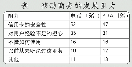 手機(jī)支付業(yè)務(wù)的進(jìn)一步發(fā)展主要受制于用戶對該項業(yè)務(wù)的接受程度。Forrester研究公司的研究表明,超過一半的被訪者認(rèn)為信用卡的安全性是移動商務(wù)發(fā)展的主要阻力。(調(diào)查結(jié)果見下表)