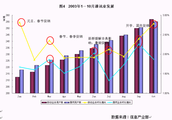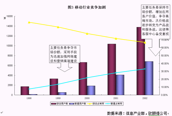 拿移動通訊業(yè)務來說,如圖3所示,截至到2002年底,中國移動的市場份額大約在65%,而聯(lián)通為35%左右,網(wǎng)絡覆蓋以及質量也越來越趨同。從國內(nèi)國外的經(jīng)驗來看,移動通訊市場的競爭正從爭奪市場份額轉變?yōu)楸3质袌龇蓊~和增加客戶價值,而主要手段正也從網(wǎng)絡建設、營銷渠道建設、價格戰(zhàn)等轉變?yōu)楫a(chǎn)品戰(zhàn)和服務戰(zhàn)。在這個階段,兩家主要的運營公司都對客戶服務非常重視。服務水平的達標,投訴流程的梳理,呼叫中心的擴大規(guī)模,電話營業(yè)廳的建設等工作是今年的重點。