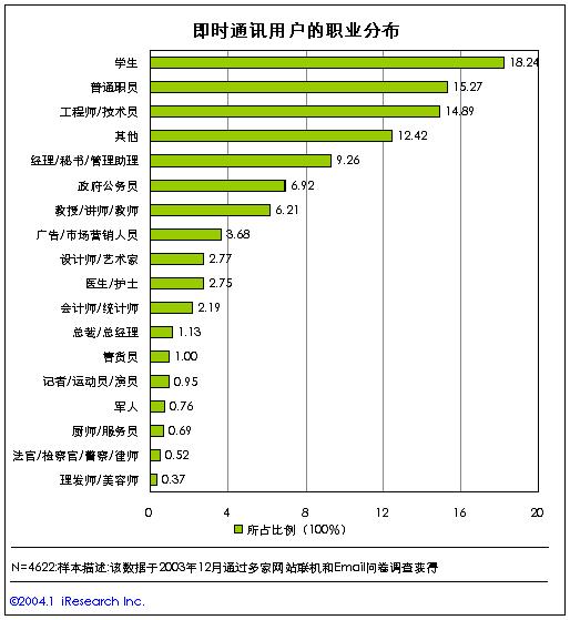 從即時通訊用戶的職業(yè)結(jié)構(gòu)來看,在中國的即時通訊用戶中,學(xué)生、普通公司職員、工程技術(shù)人員構(gòu)成了最主要的用戶群體,其中學(xué)生的比例最高,達(dá)到了18.24%?撮_學(xué)生是中國即時通訊的生力軍。