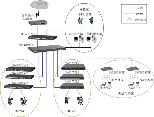 本方案采用"千兆光纖干線,百兆交換到桌面"的設(shè)計(jì)思路,各骨干線路均為1000M。骨干網(wǎng)通過(guò)高速線路接入INTERNET,網(wǎng)吧內(nèi)實(shí)現(xiàn)主干千兆交換、百兆到點(diǎn),整個(gè)網(wǎng)吧內(nèi)實(shí)現(xiàn)無(wú)阻塞通信。根據(jù)顧客的不同消費(fèi)需求,將網(wǎng)吧分為了網(wǎng)絡(luò)游戲區(qū)、聊天區(qū)、貴賓區(qū)等,根據(jù)不同區(qū)域的特點(diǎn),細(xì)化了不同網(wǎng)絡(luò)的解決方案。方案中采用的核心設(shè)備和二層設(shè)備都支持802.1Q標(biāo)準(zhǔn)VLAN和IGMP組播協(xié)議,為VOD、多媒體娛樂(lè)等豐富應(yīng)用的開(kāi)展打下了堅(jiān)實(shí)的基礎(chǔ) 。通過(guò)劃分VLAN,MAC地址綁定來(lái)劃分了不同類(lèi)型用戶(hù),很好地滿(mǎn)足網(wǎng)吧的各項(xiàng)業(yè)務(wù)應(yīng)用需求。此外,SMC的豐富無(wú)線網(wǎng)絡(luò)產(chǎn)品可以很靈活的滿(mǎn)足網(wǎng)吧的組網(wǎng)需求,投資少、施工快。在提供高性能的同時(shí),還保證很好的安全性,既支持基于802.11b標(biāo)準(zhǔn)的安全機(jī)制,又支持動(dòng)態(tài)安全鏈路,以及基于802.1x的增強(qiáng)性安全或認(rèn)證功能。