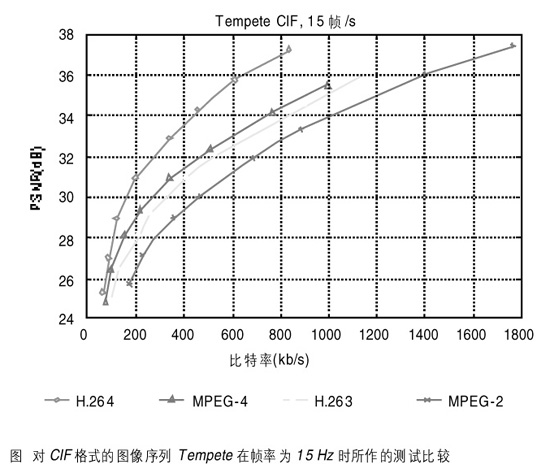 為了闡述H.264的編碼效率,我們將其與其它標準如MPEG-2、H.263、MPEG-4等作比較。使用QCIF、CIF格式的圖像序列作測試,所有編碼器都使用拉格朗日優(yōu)化技術。我們使用H.264的測試軟件JM2.0并使用了Main Profile的主要技術特征。對H.263和H.264采用的參考幀數(shù)為5,只編碼圖像序列的第一幀為I幀,每2個參考幀P之間插入2個非參考幀B。使用全搜索方式進行32×32整數(shù)范圍的運動估計,且由預先設定的量化參數(shù)來進行比特率的調整。圖為對CIF格式的圖像序列Tempete在幀率為15Hz時所作的測試比較。