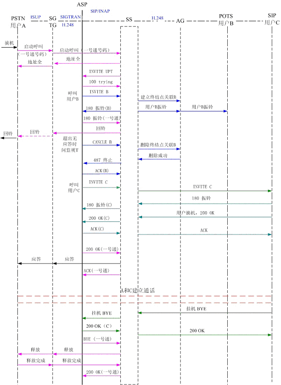 圖5為PSTN用戶A撥打一號(hào)通用戶,順呼軟交換域AG下POTS用戶B和SIP用戶C,其中軟交換和應(yīng)用服務(wù)器以SIP協(xié)議相連,軟交換和AG、軟交換和TG以H.248協(xié)議相連。可以看到,用戶B首先振鈴,振鈴達(dá)到規(guī)定時(shí)間后,應(yīng)用服務(wù)器取消了對(duì)用戶B的振鈴,轉(zhuǎn)而對(duì)用戶C振鈴。用戶C摘機(jī)應(yīng)答,通話結(jié)束,用戶C掛機(jī),系統(tǒng)釋放了呼叫。