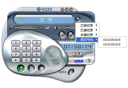 通話記錄很詳細(xì),除了“已撥”、“已接”、“未接”外,還有一項(xiàng)“測(cè)試號(hào)碼”,可以讓用戶撥打聯(lián)通“寶視通”的服務(wù)熱線測(cè)試可視電話是否正常工作,也可以向服務(wù)人員詢問(wèn)相關(guān)的服務(wù)內(nèi)容。
