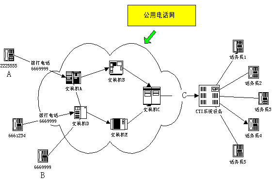 - CTI系統(tǒng)的將以企業(yè)(B)的名義對客戶(A)進行接續(xù)服務,該服務可以是語音服務,傳真服務,人工服務,可以是客戶定制的語音系統(tǒng),傳真服務系統(tǒng),會議系統(tǒng),技術(shù)支持系統(tǒng)等等。