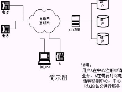 該業(yè)務方法涉及一種用戶電話轉(zhuǎn)移到CTI(Computer Telephony Integration)語音服務系統(tǒng)的接續(xù)服務方法,其CTI系統(tǒng)通過接口連接于公用電話網(wǎng),用戶在CTI系統(tǒng)登記,選擇服務功能,相關(guān)信息存入數(shù)據(jù)庫,用戶電話設(shè)置轉(zhuǎn)移;當客戶呼叫已轉(zhuǎn)移用戶電話時,自動接入CTI語音系統(tǒng),請求相關(guān)信息,對信息進行分析判斷、處理,查詢數(shù)據(jù)庫用戶信息,以用戶名義進行接續(xù)服務。其完全避免了傳統(tǒng)CTI系統(tǒng)的專用特服號碼服務的弊端,充分利用了交換機的功能,以用戶的電話號碼為客戶提供語音、傳真、數(shù)據(jù)及人工接續(xù)服務。