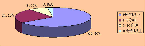 “彩話”業(yè)務(wù)主要應(yīng)用是主叫方為了通話中的和諧溝通而設(shè)置的,因此它與通話時長具有正相關(guān)性,一般短暫的工作式或通知式的通話無須主叫方設(shè)置背景音效。根據(jù)信息產(chǎn)業(yè)部提供的《電信資費(fèi)聽證會資料》,國家統(tǒng)計局對全國24個大、中、小城市電話用戶通話時長進(jìn)行了調(diào)查,調(diào)查結(jié)果見圖1所示。