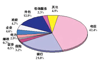 2004年中國呼叫中心席位總數(shù)為14萬個(gè),從不同行業(yè)呼叫中心席位數(shù)量看,電信行業(yè)占據(jù)60%以上的市場份額,制造企業(yè)占6.5%,政府占5.65%,銀行占5.58%。2004年中國呼叫中心投入205.0億元,從不同行業(yè)呼叫中心投入絕對值看,電信行業(yè)占據(jù)42.4%,銀行占21.0%,外包占12.9%,其他行業(yè)市場份額均低于5.0%。