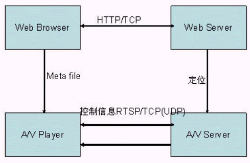 流式傳輸模式一般會使用RTP/UDP、RTSP/TCP兩種通信協(xié)議與A/V(Audio/Video)Server建立聯(lián)系,將服務(wù)器的輸出重定向到一個運行A/V Player程序所在客戶機的目的地址。如圖1所示,流式傳輸系統(tǒng)一般都要配置一套專用的服務(wù)器和播放器。
