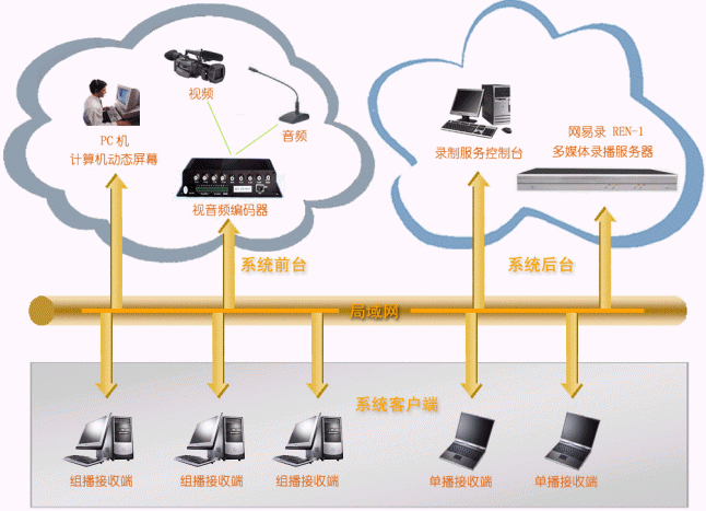 - 系統(tǒng)后臺(tái):連接在網(wǎng)絡(luò)上即可,接受REN-1服務(wù)器管理端發(fā)送來的系統(tǒng)管理、維護(hù)指令,并負(fù)責(zé)將系統(tǒng)前臺(tái)發(fā)送來的視頻、音頻、計(jì)算機(jī)動(dòng)態(tài)屏幕進(jìn)行實(shí)時(shí)錄制和直播,它包括:網(wǎng)易錄媒體中心(REN-1),它為系統(tǒng)的核心,主要完成視頻、音頻、計(jì)算機(jī)動(dòng)態(tài)屏幕的錄制和直播;