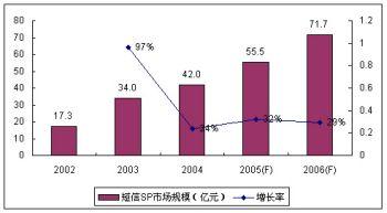 繼2004年中國政府和運營商監(jiān)管力度的加大,2005年的短信SP市場規(guī)模增長率為32%,SP市場規(guī)模55.5億元,比2004年略有上升。基于目前短信市場增量市場的縮小,其增長主要依靠對存量市場需求的深度挖掘。諾盛預計2006年的短信市場繼續(xù)保持平穩(wěn)的增長勢頭,增長率將達29%。
