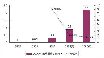 作為SP和移動運營商都非?春玫臉I(yè)務,JAVA業(yè)務受到眾多SP的青睞。盡管作為JAVA主要業(yè)務的手機游戲目前盈利狀況普遍欠佳,但空中網(wǎng)、美通無線、數(shù)字魚等SP仍然大量投入,期待著未來業(yè)務的高速增長。受制于終端和JAVA游戲的表現(xiàn)力,2005年JAVA業(yè)務的SP市場規(guī)模增長率回落到200%,諾盛預計2006年JAVA的使用環(huán)境沒有太大變化,其增長率進一步回落至144%。