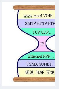 RFC1958和RFC3724等所描述的“端到端的透明性”是Internet一直堅(jiān)持的為數(shù)不多的Internet體系架構(gòu)的核心設(shè)計(jì)理念。所謂端到端的透明性,就是在TCP/IP的設(shè)計(jì)中,將Internet系統(tǒng)中與通信相關(guān)的部分(IP網(wǎng)絡(luò))與高層應(yīng)用(端點(diǎn))分離,最大限度地簡(jiǎn)化網(wǎng)絡(luò)的設(shè)計(jì)。在有些文獻(xiàn)中也稱其為“沙漏”模型,如圖1。