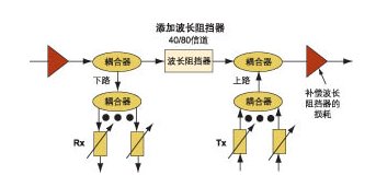 一些基于廣播和選擇結(jié)構(gòu)的ROADM提供了很多波長,可以克服這種結(jié)構(gòu)固有的缺乏波長重用的缺點(diǎn)。流量異常增加需要在某些點(diǎn)重用波長時,可以增加波長阻擋器(見圖2)。