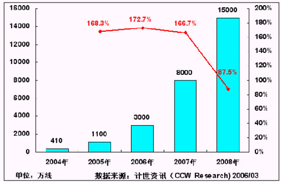 主流運(yùn)營(yíng)商N(yùn)GN網(wǎng)絡(luò)的規(guī);ㄔO(shè),為IP Centrex、寬帶電話等新業(yè)務(wù)在國(guó)內(nèi)的大規(guī)模應(yīng)用提供了良好的支撐。計(jì)世資訊(CCW Research)預(yù)計(jì),在未來3年內(nèi),中國(guó)的NGN網(wǎng)絡(luò)建設(shè)規(guī)模將獲得快速增長(zhǎng),到2008年,將有望達(dá)到1.5億線的規(guī)模。