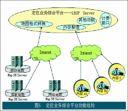 在上述結(jié)構(gòu)中,定位業(yè)務(wù)綜合平臺(tái)LBSP扮演著重要角色。其功能結(jié)構(gòu)如圖5所示。在該平臺(tái)中提供位置類信息業(yè)務(wù)的業(yè)務(wù)運(yùn)營支撐功能,包括計(jì)費(fèi)功能(以及和BOSS系統(tǒng)的接口);同時(shí)該平臺(tái)還扮演著接入不同內(nèi)容開發(fā)商的重要角色。不同的內(nèi)容開發(fā)和提供商通過該平臺(tái)向最終用戶提供具體的業(yè)務(wù)和應(yīng)用,運(yùn)營商通過該平臺(tái)對(duì)不同內(nèi)容開發(fā)商提供的內(nèi)容進(jìn)行管理和整理,使面向用戶的應(yīng)用能夠順利得到展現(xiàn)。該平臺(tái)提供的另一個(gè)重要角色是肩負(fù)著接入地圖信息提供商的重任,并在該平臺(tái)中通過地圖格式的轉(zhuǎn)換使不同地圖提供商所提供的地圖信息能夠以一致的格式向用戶提供。