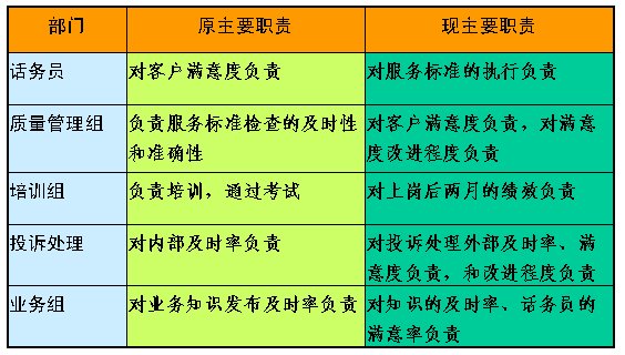 首先,要根據組織的目標來確定我們需要哪些流程,即需要哪些流程才能保證組織目標的實現(xiàn);其次,根據流程的需要,即為了保證流程的有效運行,來劃分不同部分的職責;最后,根據各部分職責的劃分來設置組織的架構。如我們根據客服中心流程運行的需要,對組織架構和相關班組的主要職責進行了調整,以保證流程的有效順暢運行。如部分班組的主要職責調整如下: