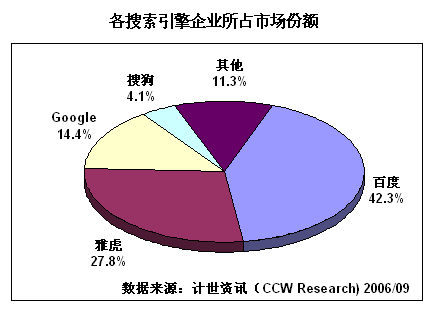 互聯(lián)網(wǎng)上的信息浩如煙海,是典型的信息爆炸,因此絕大多數(shù)網(wǎng)民都必須依靠搜索引擎才能找到所需信息,這個龐大的需求也就注定了搜索引擎市場的興旺繁榮。計世資訊(CCW Research)數(shù)據(jù)顯示:2004年中國的搜索引擎市場銷售總額達(dá)到9.4億元人民幣,增長67.9%,2005年繼續(xù)保持47.9%的增長速度,達(dá)到13.9億元,到2006年預(yù)計這個數(shù)字將突破20億元大關(guān)。