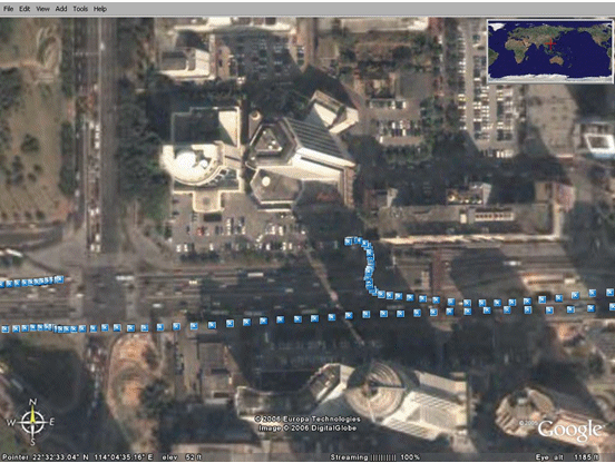 下圖顯示的是在中國深圳市進(jìn)行汽車試駕時的GPS數(shù)據(jù),利用的是Google earth應(yīng)用程序。圖中的每一個藍(lán)點(diǎn)代表一個GPS讀數(shù)。這些點(diǎn)在每隔一秒的時間內(nèi)讀出,因此,連續(xù)點(diǎn)之間的距離就代表著汽車的速度。我們甚至可以看見汽車駛?cè)氪髽堑耐\噲觥?br />