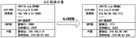 NAPT一般只完成IP層地址的轉(zhuǎn)換,而軟交換協(xié)議(如H.323、SIP、MGCP等)需要依靠封裝在高層的地址信息完成通信。一方面,由于NAPT不能相應(yīng)地修改這些封裝在協(xié)議包內(nèi)的地址,使軟交換系統(tǒng)無法獲得終端正確的地址信息,結(jié)果造成無法建立通信;另一方面,私網(wǎng)設(shè)備只有在向外部主動(dòng)發(fā)起連接時(shí),才會(huì)被分配到合法IP和端口號(hào)。若不做特殊處理,設(shè)備對(duì)外部網(wǎng)絡(luò)來說是不可見的,也無法接受軟交換發(fā)來的呼叫請(qǐng)求。