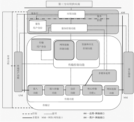 圖2展示了下一代網(wǎng)絡(luò)結(jié)構(gòu)。根據(jù)Y.2011建議書(shū),下一代網(wǎng)絡(luò)的功能分為服務(wù)層和傳輸層。終端用戶功能由用戶-網(wǎng)絡(luò)接口(UNI)接到下一代網(wǎng)絡(luò),而其他網(wǎng)絡(luò)則通過(guò)網(wǎng)絡(luò)—網(wǎng)絡(luò)接口(NNI)互相連接。