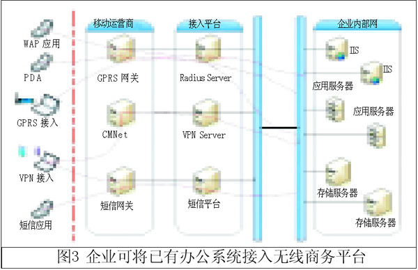 這里介紹的無線商務(wù)平臺適合沒有成型信息系統(tǒng)的企業(yè)接入,對于企業(yè)已經(jīng)建有辦公系統(tǒng)的情況,可以提供專線接入的無線商務(wù)解決方案(如圖3所示),企業(yè)通過專線接入無線商務(wù)平臺,這種情況需要對企業(yè)辦公系統(tǒng)進行一定的改造來實現(xiàn)全部移動辦公功能。