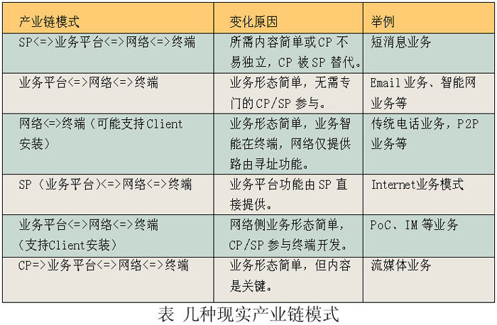 CP=> SP< =>業(yè)務(wù)平臺< =>網(wǎng)絡(luò)< =>終端,而現(xiàn)實中的產(chǎn)業(yè)鏈模式可以通過該模式變化得到,如下表所示。