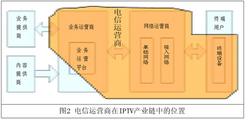 根據(jù)以上的分析,可以看出,電信運營商在IPTV產(chǎn)業(yè)鏈中居于主導(dǎo)地位,但與廣電部門的關(guān)系仍然需要理順,才能真正在IP網(wǎng)絡(luò)上發(fā)展好視頻類業(yè)務(wù)。圖2示意了電信運營商在IPTV中的位置。