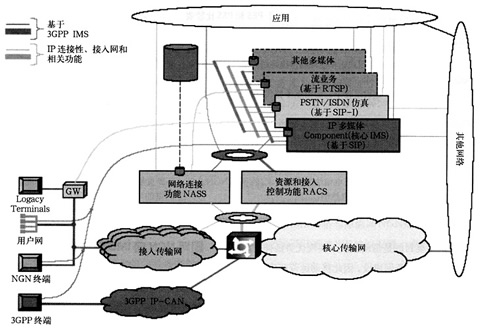 業(yè)務層包括下面的元素:PSTN/ISDN模擬子系統(tǒng)(PSS)即IMS核心子系統(tǒng)、PSTN/ISDN仿真子系統(tǒng)(PES)、其他多媒體子系統(tǒng)(如流媒體子系統(tǒng)、內(nèi)容多播子系統(tǒng)等)和應用以及可以用于多個子系統(tǒng)的公共元素(如接入應用、計費功能、用戶屬性管理、安全管理和路由管理等);傳送層為用戶終端提供了基本的IP連接的能力,其中的網(wǎng)絡附屬子系統(tǒng)(NASS)和資源認證控制子系統(tǒng)(RACS)屏蔽了IP層以下的接入網(wǎng)/核心網(wǎng)所使用的傳送技術,給固網(wǎng)NGN用戶終端提供了IP的連續(xù)性。