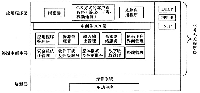 業(yè)務(wù)無關(guān)程序?qū)樱喊ǜ鞣N直接運行在操作系統(tǒng)之上,與IPTV業(yè)務(wù)無關(guān)的程序,如DHCP、PPPoE接入認(rèn)證程序等。程序直接運行在OS之上,可以提高運行效率。這些程序與終端中間件軟件一樣,在引入新的機頂盒時要進行移植,但這些程序通常具有業(yè)務(wù)無關(guān)性,遵循通用的接口協(xié)議,因此能做到快速移植。