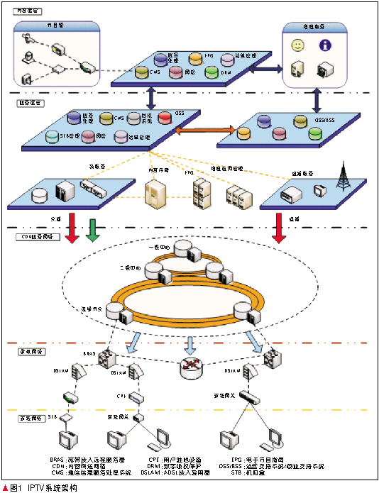 圖1所示為IPTV系統(tǒng)架構。IPTV通用系統(tǒng)的邏輯結構由內容運營平臺、業(yè)務運營平臺、內容傳送(CDN)業(yè)務網絡、承載網絡、家庭網絡5部分所構成。