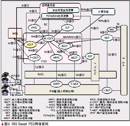 IMS Based PES網絡架構如圖3所示。IMS Based PES系統(tǒng)在IMS架構的基礎上新增接入網關控制功能(AGCF)實體,其他實體均與IMS原有實體對應,但在功能上有差異和擴展。傳統(tǒng)的終端和/或訪問節(jié)點通過媒體網關(MG)和網關(GW)接入公共交換電話網/綜合業(yè)務數字網仿真子系統(tǒng)(PES)。