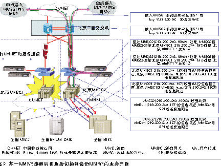 為驗證基于IP尋址的彩信網(wǎng)關(guān)備份方案的現(xiàn)網(wǎng)可行性,2006年12月6日在北京MMSG進行了容災(zāi)備份的測試。當(dāng)時,北京MMSG1已經(jīng)割接入網(wǎng),承載空中網(wǎng)公司、Sina公司的業(yè)務(wù),北京MMSG2正在進行測試,TOM公司進行配合。
