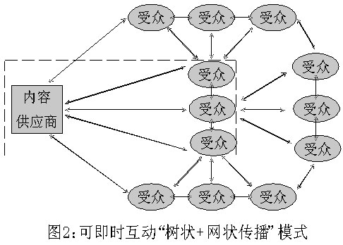 我們認(rèn)為,手機短信新聞的傳播方式,是“樹狀+網(wǎng)狀傳播”,即由新聞內(nèi)容提供方完成點到面的“樹狀傳播”后,信息接受終端又可以完成一個“網(wǎng)狀傳播”。因此,手機短信新聞,不僅傳播鏈較長,而且可以相互交錯形成網(wǎng)狀互動,“傳者”和“受者”可以隨時出現(xiàn)“角色互換”。(見圖2)