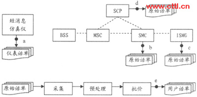 通過對移動點(diǎn)對點(diǎn)短消息計費(fèi)原理的分析,可以把整個計費(fèi)過程劃分為兩大環(huán)節(jié):計費(fèi)點(diǎn)原始話單的生成和后期計費(fèi)處理系統(tǒng)的處理。如果其中任何一個環(huán)節(jié)出現(xiàn)差錯都會降低用戶計費(fèi)話單的準(zhǔn)確性。因此在測試過程中采取了用戶層面和設(shè)備層面相結(jié)合的方法:一方面使用仿真儀表大量模擬點(diǎn)對點(diǎn)短消息的發(fā)送和接收,得到用戶話單;一方面分析各個計費(fèi)點(diǎn)生成的原始話單。