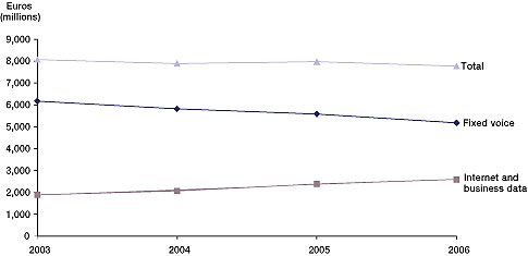 但問題是,在發(fā)達(dá)國家,用戶寬帶接入市場已經(jīng)接近飽和。正因?yàn)槭沁@樣一種情況,所以用戶數(shù)量也就很難再有增加。ARPU值在極大的競爭壓力下也很難有很大的突破。一切都靜止不動(dòng),固話收入持續(xù)下降,所以圖中的“'Internet