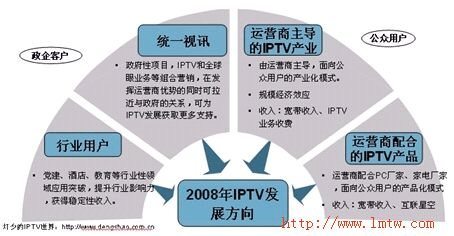 2008年,IPTV市場(chǎng),因?yàn)榘l(fā)展速度明顯慢于了市場(chǎng)進(jìn)度和技術(shù)演進(jìn)。因此在原有的運(yùn)營(yíng)商產(chǎn)業(yè)化推動(dòng)形勢(shì)下,終端廠家推動(dòng)下的產(chǎn)品化發(fā)展模式也會(huì)得到更大的發(fā)展空間,而這在一定程度上雖會(huì)推動(dòng)用戶對(duì)IPTV的認(rèn)知度,同時(shí)也會(huì)分化一部分IPTV產(chǎn)業(yè)化的動(dòng)力。