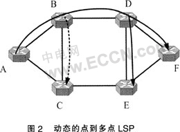 ....用圖2所示的6節(jié)點(diǎn)光網(wǎng)絡(luò)來闡述整個(gè)組播信令流程。與IP組播不同,點(diǎn)到多點(diǎn)LSP并不需要額外的組播組管理協(xié)議。這是因?yàn)槿~子節(jié)點(diǎn)的地址直接被包括在請求中,而不像IP組播中僅僅只是使用一個(gè)D類地址。所有的組播樹請求都將用一個(gè)三元組來表示{T,a,L},其中T是組播樹的標(biāo)識符,s是源節(jié)點(diǎn),L是組播樹的葉子集合。當(dāng)T等于O的時(shí)候意味著這是一個(gè)組播樹建立請求。例如,源節(jié)點(diǎn)A希望建立一個(gè)到葉子E和F的組播樹,那么這個(gè)請求就被表示為{0,A,{E,F(xiàn)}}。當(dāng)這顆樹被建立后,它將被分配一個(gè)全局唯一的標(biāo)識符,比如1。請求{1,A,{C1}}和{1,A,{F}}則分別意味著將葉子C嫁接到組播樹1和將葉子F從組播樹1中剪除。如果想刪除整棵樹,只需要將組播樹1的所有葉子都剪除即可,即{1,A,{C,E}}。
