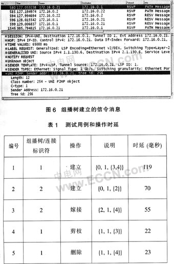 1出發(fā)的組播樹和單播連接,結(jié)果如表1所列。圖6顯示了Ethereal捕獲的組播樹建立的信令消息。在解開的Path消息中,可以發(fā)現(xiàn)經(jīng)過擴(kuò)展的UNI組播對象。然后,對已存在的連接進(jìn)行了動態(tài)的修改。在第三個(gè)測例中,一個(gè)葉子被添加到單播連接上并使其變?yōu)橐豢媒M播樹。在嫁接和剪枝的操作中,業(yè)務(wù)生成器在已建立的連接上沒有觀察到丟包的現(xiàn)象。
