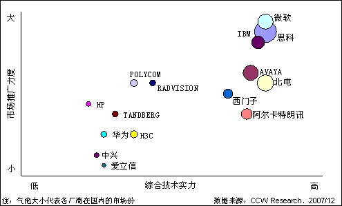 市場競爭非常激烈,但還沒有一個廠商占據(jù)對優(yōu)勢。目前統(tǒng)一通信市場形成了兩類供應(yīng)商的競爭:電信網(wǎng)絡(luò)設(shè)備廠商(如思科、北電)和軟件廠商(如微軟、IBM)。電信設(shè)備廠商的優(yōu)勢集中在硬件產(chǎn)品上,比如路由器、VoIP網(wǎng)關(guān)產(chǎn)品、軟交換設(shè)備;而軟件廠商,像微軟、IBM的優(yōu)勢在于其在電腦桌面上的絕對統(tǒng)治力,幾乎所有的統(tǒng)一通信企業(yè)都需要和微軟、IBM進行合作。但從現(xiàn)在的發(fā)展?fàn)顩r來看,各類廠商之間既有競爭又有合作,但還沒有一個廠商占據(jù)對優(yōu)勢。