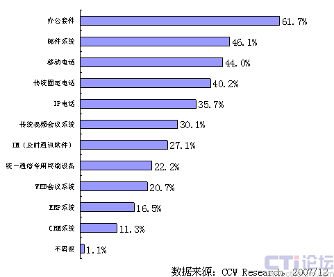 盡管統(tǒng)一通信的概念已經被各大廠商廣為宣傳,統(tǒng)一通信的目標是實現(xiàn)各種溝通方式的融合,但是從國內的企業(yè)來看,他們對統(tǒng)一通信的認識仍然還處于比較模糊的階段,那么從用戶本身來講,他們最需要統(tǒng)一通信能把哪些功能實現(xiàn)相互融合呢?2007年底,國內ICT市場研究咨詢機構計世資訊(CCW Research)對國內的潛在用戶進行了一次大樣本調研,被調研的企業(yè)數(shù)量超過800家,企業(yè)領域分布在各行各業(yè),重點以大中型企業(yè)為主,調研結果表明,目前國內企業(yè)用戶希望能實現(xiàn)互聯(lián)互通功能排在第一位的是辦公套件、占到所有被調研對象的六成以上,其次是郵件系統(tǒng)和移動電話,占近一半的比例,之后是固話、視頻會議和即時通信,而和用戶業(yè)務系統(tǒng)的整合,如ERP、CRM則排在最后。