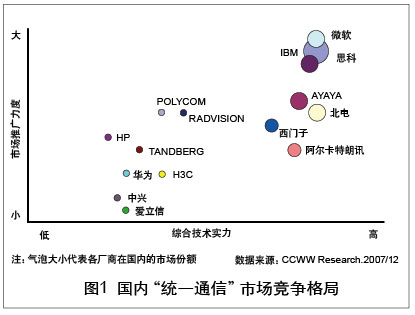 “統(tǒng)一通信”與傳統(tǒng)通信的根本區(qū)別在于不僅僅是網(wǎng)絡(luò)的融合,也是應(yīng)用的融合。從這個(gè)層面來看,“統(tǒng)一通信”真正帶給用戶的是成本的降低、工作效率的提升以及整個(gè)運(yùn)行機(jī)制的改變!敖y(tǒng)一通信”是以人性化為特征應(yīng)用層面的融合,這種融合囊括了更多的內(nèi)容、覆蓋更廣闊的領(lǐng)域、具有更大的力量,它使得通信產(chǎn)業(yè)與IT產(chǎn)業(yè),通信設(shè)備商、軟件廠商與電信運(yùn)營商之間的邊界越來越模糊,跨行業(yè)、跨領(lǐng)域的聯(lián)盟與合作成為開拓市場(chǎng)的必需。但隨著眾廠商的紛紛加入,多款“統(tǒng)一通信”產(chǎn)品及解決方案的推出,“統(tǒng)一通信”市場(chǎng)展現(xiàn)出了勃勃生機(jī)和巨大的成長潛力。在這些廠商中,有市場(chǎng)調(diào)研數(shù)據(jù)顯示思科市場(chǎng)份額領(lǐng)先,市場(chǎng)占有率高達(dá)35%。各類廠商之間既有競(jìng)爭又有合作,但還沒有一個(gè)廠商占絕對(duì)優(yōu)勢(shì)。實(shí)際上,“統(tǒng)一通信”市場(chǎng)上的競(jìng)爭者并不僅僅是這幾家巨頭,眾多網(wǎng)絡(luò)工具廠商、商用電話廠商也參與了這一競(jìng)爭平臺(tái)。幾乎所有和ICT有關(guān)的巨頭廠商都集中在了這個(gè)領(lǐng)域,“統(tǒng)一通信”正進(jìn)入群雄爭霸的時(shí)代。國內(nèi)“統(tǒng)一通信”市場(chǎng)競(jìng)爭格局如圖1所示。